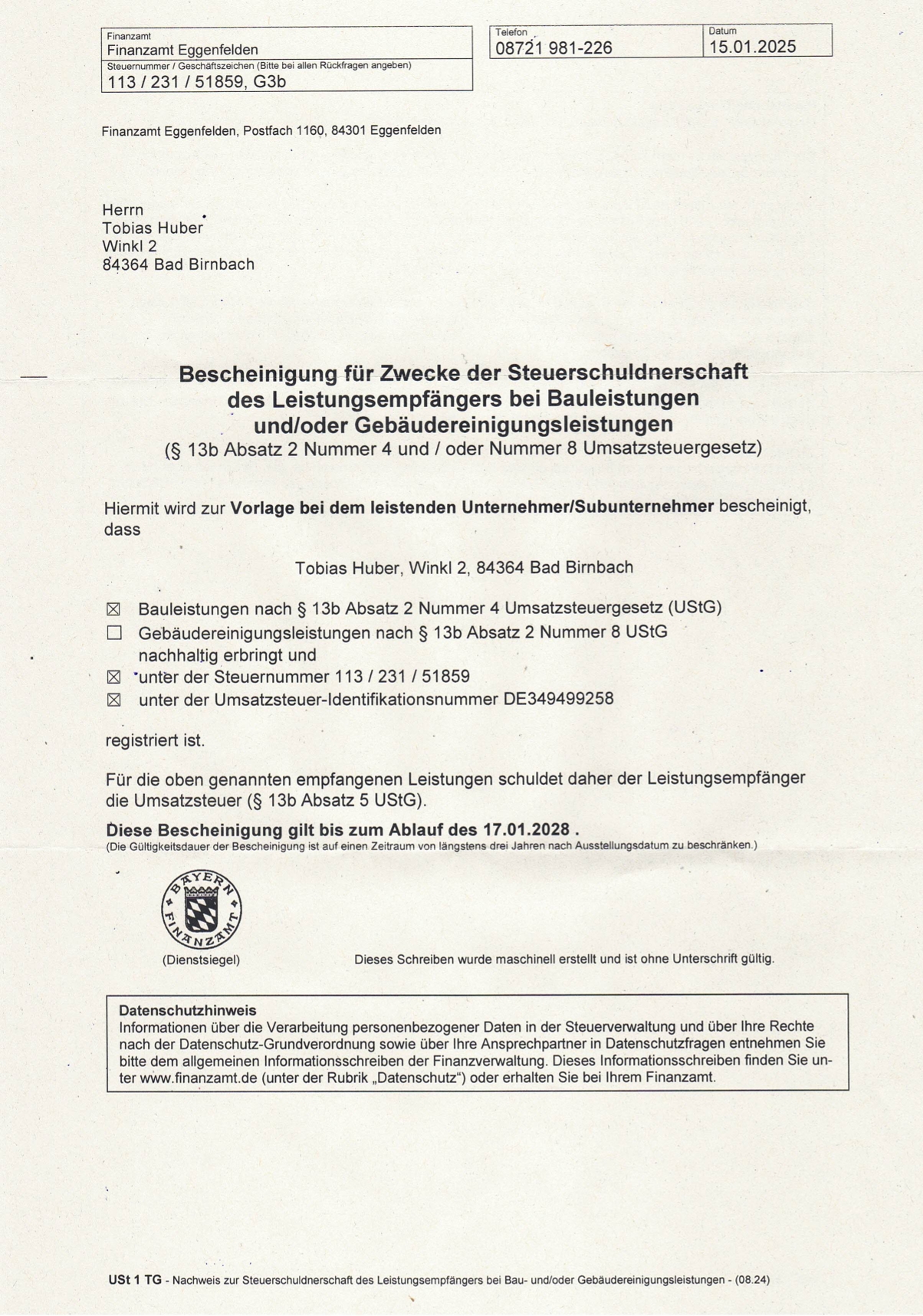 Nachweis zur Steuerschuldnerschaft